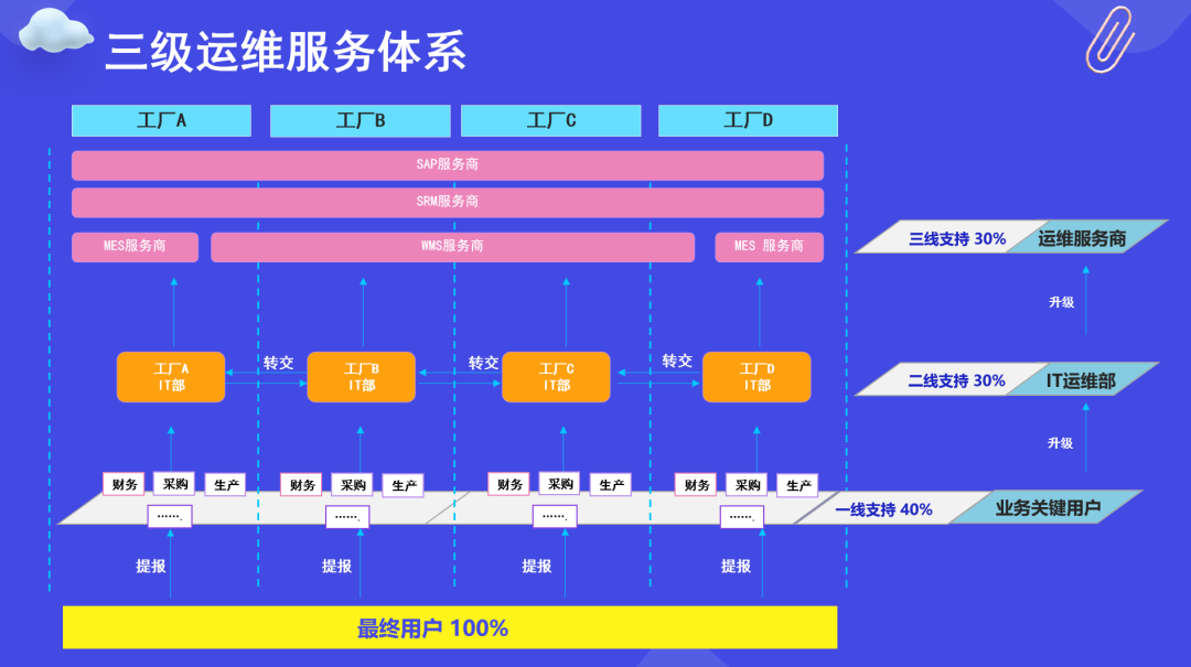 整合了一线业务部门关键用户,内部IT作为二线支持,多家三方供应商作为三线支持,共同形成了燎旺车灯三级服务体系,采用统一的服务级别管理(SLA)对IT故障按照不同的优先级设定了响应时长和解决时长,从而提升IT故障的响应和处理效率。