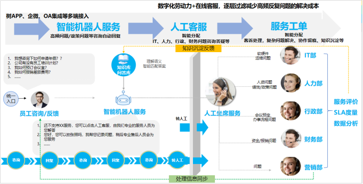 为了解决企业在信息共享、知识系统化及经验传承方面的迫切需求,三棵树引入了以自助服务为主的AI智能机器人、人工在线客服服务和工单提报处理跟踪服务为核心的三级共享服务流程。通过这一方案,我们的目标是提升员工对信息的获取速度、知识传递的效率和问题的处理效率,从而确保更高质量的工作决策和整体效率的提升。