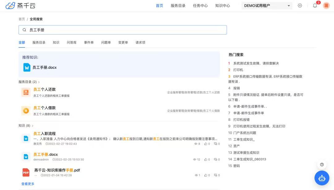 对于标准故障或常见使用问题,燕千云ITSM可通过智能客服与AI知识库引导用户自行排查与处理,显著提升效率与经验复用率。