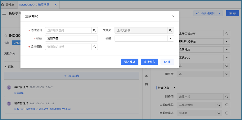 知识管理:按按业务领域创建知识目录与模板,支持工单一键转知识、答复时引用知识,实现知识沉淀与复用。