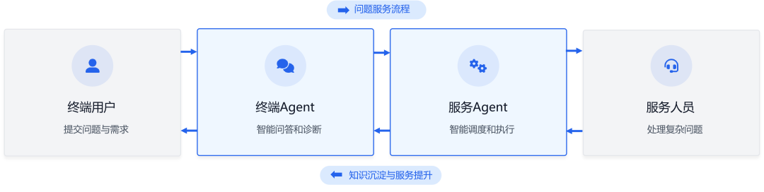 终端Agent充当企业服务的“数字门户”,不仅具备自然语言理解能力,更通过与AI知识库及自动化应用的深度集成,实现了诉求的自助解决。