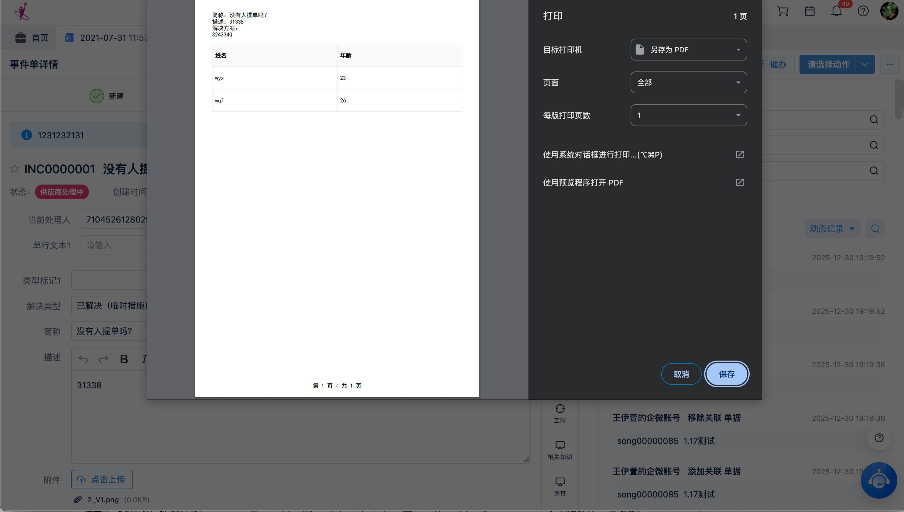 子对象集成导出:通用导出功能实现了父子对象数据的联动,例如在导出事件单时,可同步导出其下属的回复记录。