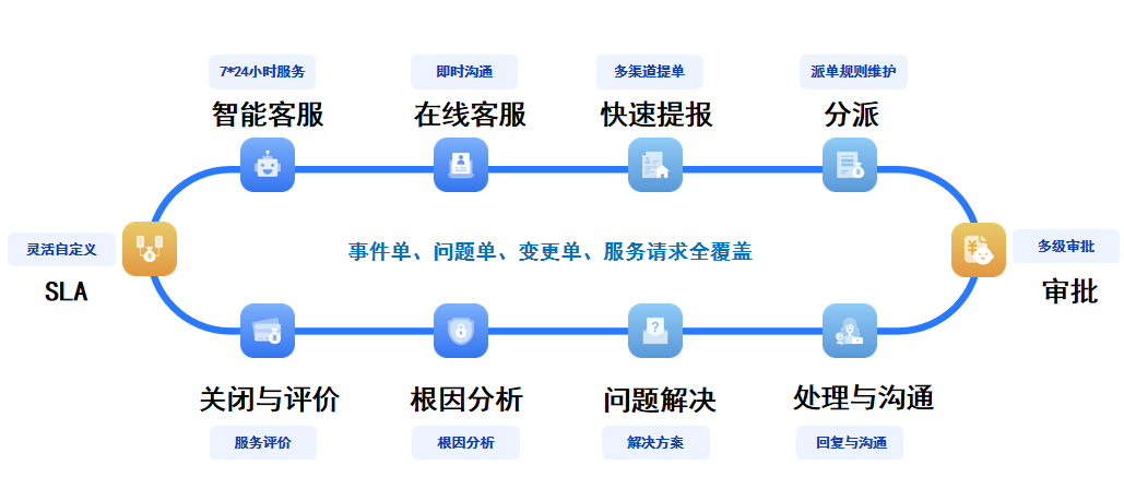 全生命周期管理能力:通过智能交互触点、自动化流程引擎、全生命周期资产管理、AIGC知识中枢以及数字化决策的深度协同,实现了从故障触发、自动流转到根因解决的全流程闭环。