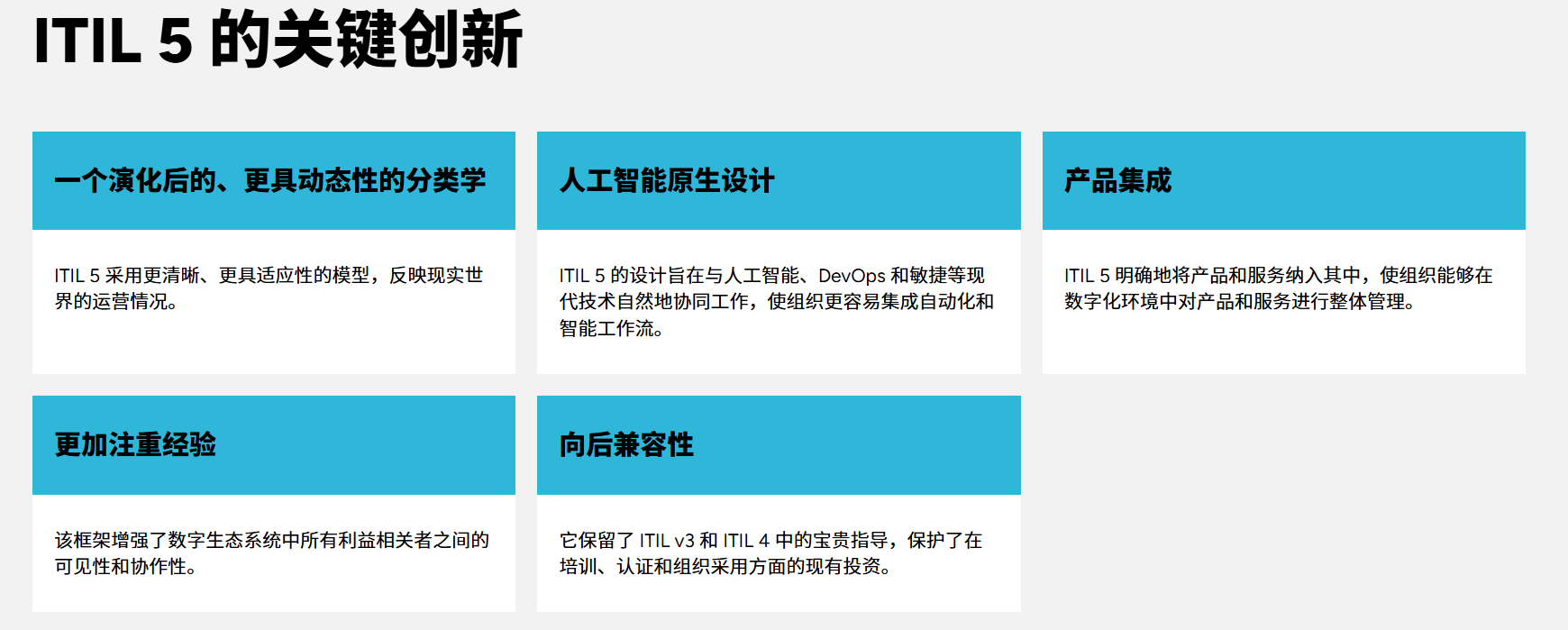 此次ITIL 5的问世,不仅标志着管理标准的版本更新,更宣告了IT服务管理(ITSM)正式进入“数字化产品与服务”与“AI原生集成”的新阶段。